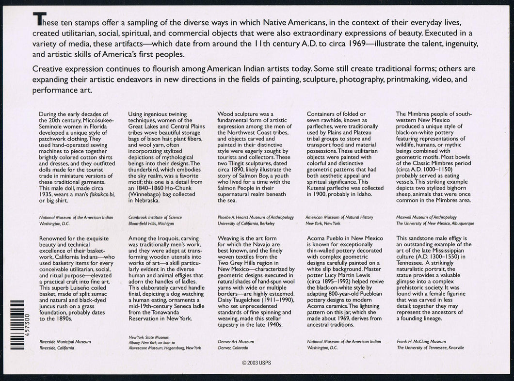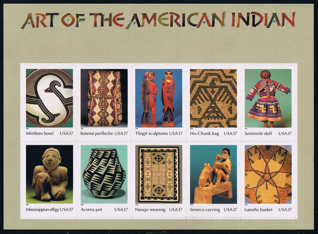 Tlingit sculpture, Seminole doll, Mississippian effigy, Navaho weaving, Seneca carving and others.