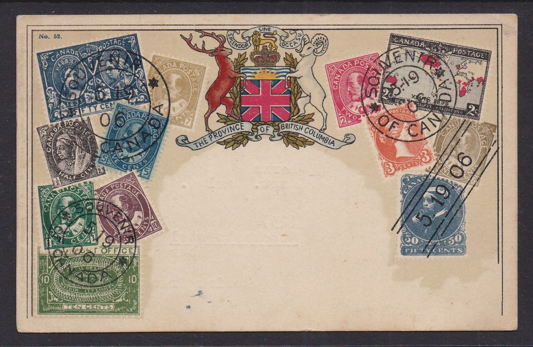 Philatelic usage of a Province of British Columbia picture card depicting early Canadian stamps including their first Special Delivery stamp.